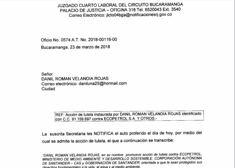 El Juzgado Cuarto Laboral del Circuito de Bucaramanga la admitió y ordenó a las entidades a más tardar este lunes 26 de marzo contener definitivamente la salida del crudo.