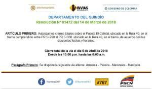 Según la resolución del Invias este cierre temporal de ocho horas está contemplado en el puente el Cafetal.
