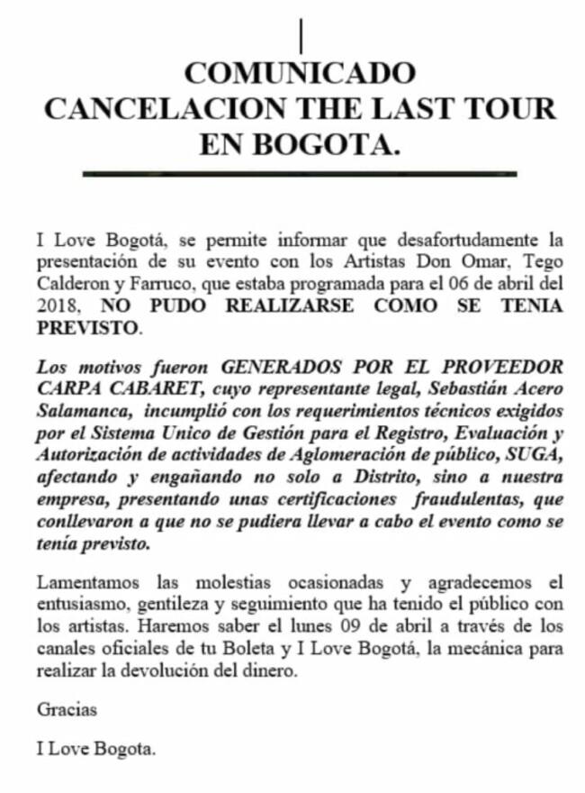 Por su lado, I Love Bogotá sacó un comunicado explicando las razones de la cancelación del evento