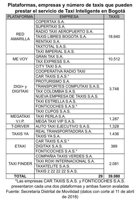 A la fecha la Secretaría Distrital de Movilidad ha avalado ocho de doce plataformas habilitadas ante el Ministerio de Transporte para prestar el servicio de taxi Inteligente en la ciudad. Estas primeras plataformas avaladas les permiten a 29 empresas operar con la nueva tecnología y a 39.080 taxis (78% del parque con tarjeta de operación vigente), instalar los dispositivos para atender los servicios y cobrar la nueva tarifa.