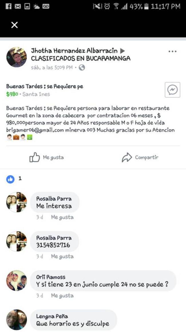 En Facebook aparecen convocatorias para laborar con redes sociales. Ivonne, estudiante de Comunicación Social de la Universidad Autónoma de Bucaramanga atendió el aviso y llamó al celular que se indicaba. Quien atendió al otro lado de la línea le puso una cita en un restaurante de la calle 36 con carrera 32, en el oriente de la ciudad.