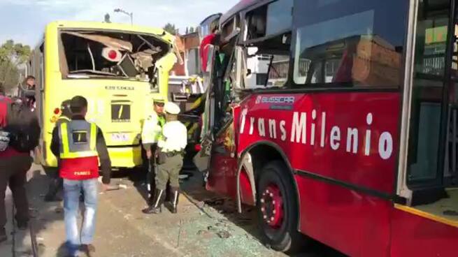 La Policía de Tránsito investiga las causas del accidente de dos buses articulados de Transmilenio en la Avenida Caracas con Calle 28 sur en Bogotá, que dejó 27 personas heridas.