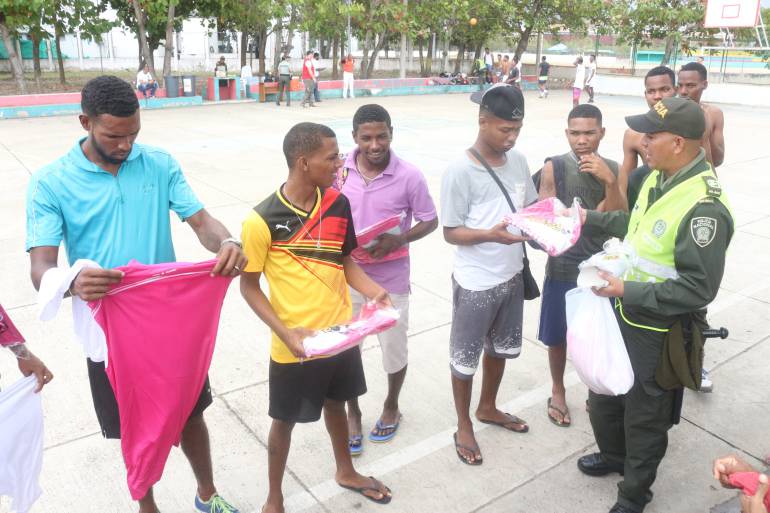 Dentro de la estrategia, la Policía Metropolitana de Cartagena, lidera un torneo de futbol donde participaron seis equipos, cada uno de los integrantes recibieron uniformes nuevos de sus equipos favoritos, e implementos deportivos para participar del campeonato, viéndolos sonreír y modelar sus nuevos uniformes.