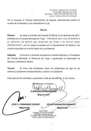 “Recordemos que el Gobernador de Boyacá pidió declarar inválido el Estatuto de Rentas de Tunja al considerar que el 31 de diciembre de 2017 era domingo, razón por la cual el alcalde no podía sancionar y publicar el Acuerdo 030 de 2017; dijo que, por la anterior razón, tales procedimientos podían llevarse a cabo únicamente a partir del 2 de enero de 2018, con lo cual el Acuerdo sólo podía tener efectos en la vigencia siguiente, es decir, a partir del 1o de enero de 2019”, explicó en Caracol Radio el magistrado Luis Ernesto Arciniegas.