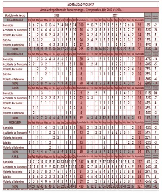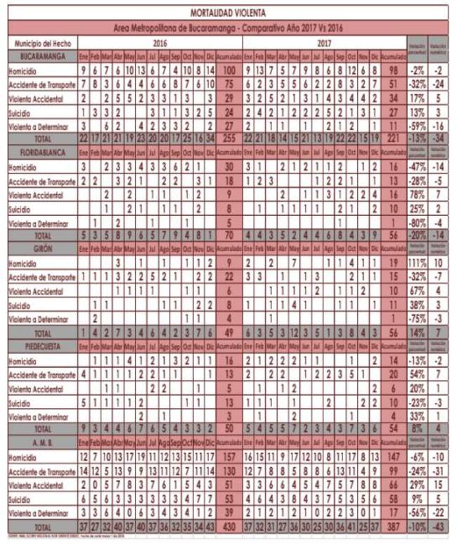 Medicina Legal certificó que el número de homicidios disminuyó en toda el área metropolitana de Bucaramanga, durante 2017 si se compara con el cuadro de violencia ocurrido en 2016. La reducción fue del 10% pues ocurrieron 43 delitos contra la vida menos que en la anterior vigencia. En total, el año pasado ocurrieron 387 homicidios en los cuatro municipios del área lo cual significa que en promedio uno por día.