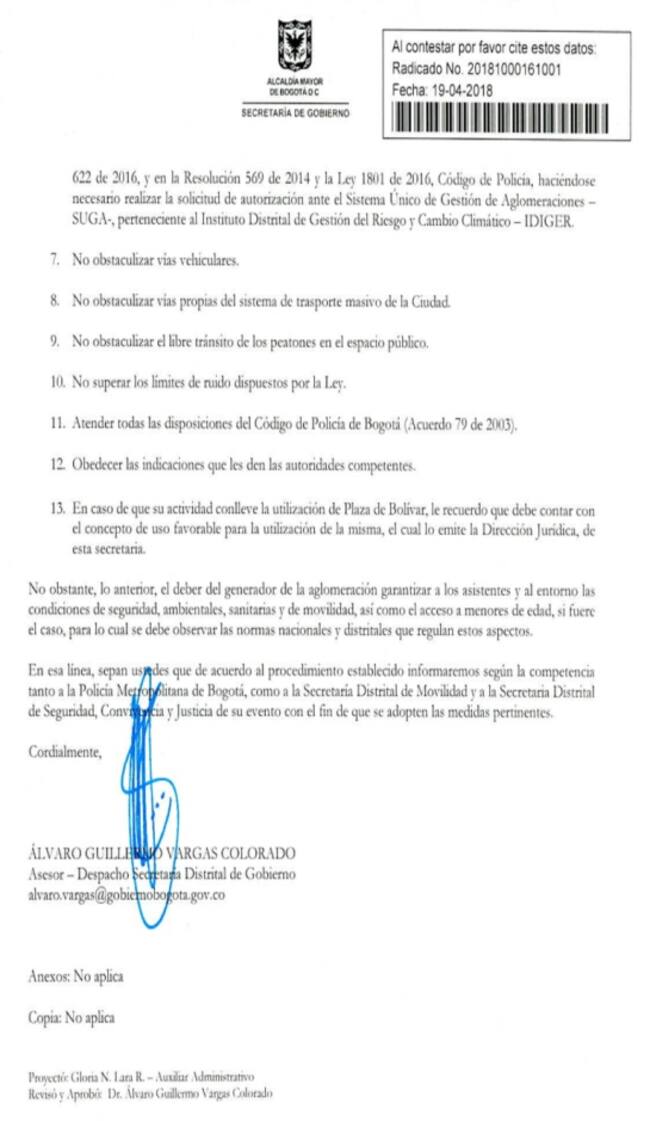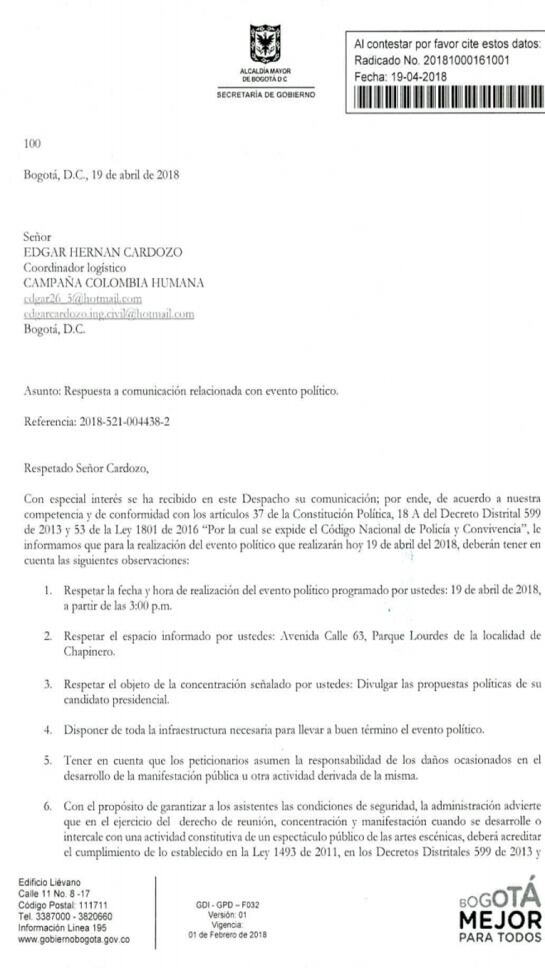 La entidad autorizó la realización el evento convocado en la plaza de Lourdes en Chapinero. Sin embargo, estableció varias condiciones como respetar la hora y fecha de realización de la convocatoria política.