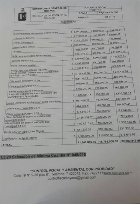 Según el informe preliminar que adelanta la Contraloría de Boyacá, en un contrato firmado el 16 de marzo de 2016 por un valor total de $68.408.860, se percataron de la adquisición de “mesas, sillas, espejos, cortinas, camas, cubiertos, entre otros, que no contribuyen para nada con el funcionamiento de la Gobernación de Boyacá”.