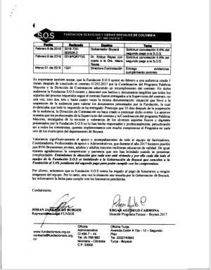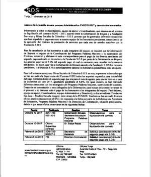 3. A la fecha en la Dirección de Contratación del Departamento de Boyacá se encuentra en trámite el procedimiento para determinar el posible incumplimiento por parte de la Fundación SOS, con ocasión del no pago de los honorarios a los facilitadores y personal administrativo, procedimiento al cual fue convocada la Previsora S.A. como aseguradora del contratista.