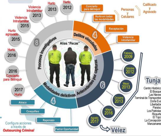 Alias ‘Pecas’lideraban en Tunja el grupo delincuencial denominado Los Mate 8, quienes se dedicaban principalmente al hurto de celulares. Es un actor prolífico y reincidente que también tenía vínculos con los grupos delincuenciales ya desarticulades: Las Lizas, Los Pinzones, Los de la 15, Los Mate, y otros en Boyacá y Bogotá.