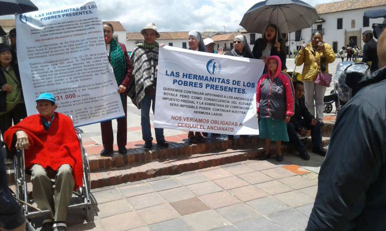 “Son las hermanitas de los pobres. Ellas se van todos los días a las calles a pedir limosna para sostenernos a nosotros los ancianos, y nos tratan muy bien. Nos tienen siempre la mesa puesta, no sé cómo hacen, pero no falta el desayuno, las medias nueves, el almuerzo, las onces y la cena; nos lavan y planchan la ropa muy bonito, nos hacen felices; entonces creemos que es injusto que estas hermanitas tengan que pagar tan caro por un impuesto predial, sabiendo que viven realmente de la misericordia de Dios y de la caridad de la gente de buen corazón”, dijo una de las abuelas que desde su silla de ruedas protestó.