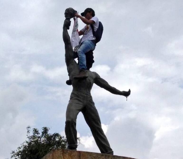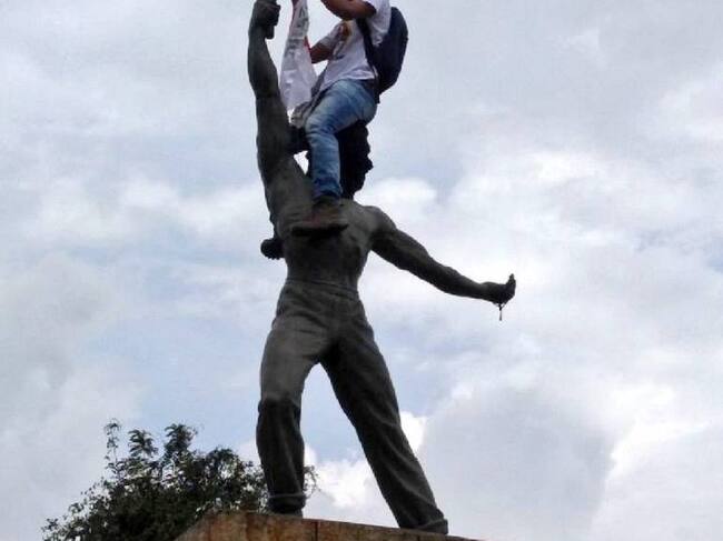 Un hombre se subió a colocar una bandera en la escultura de José Antonio Galán, llamada Galán Comunero, que se encuentra en el parque de los Niños.