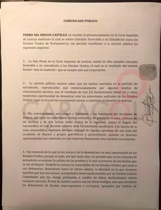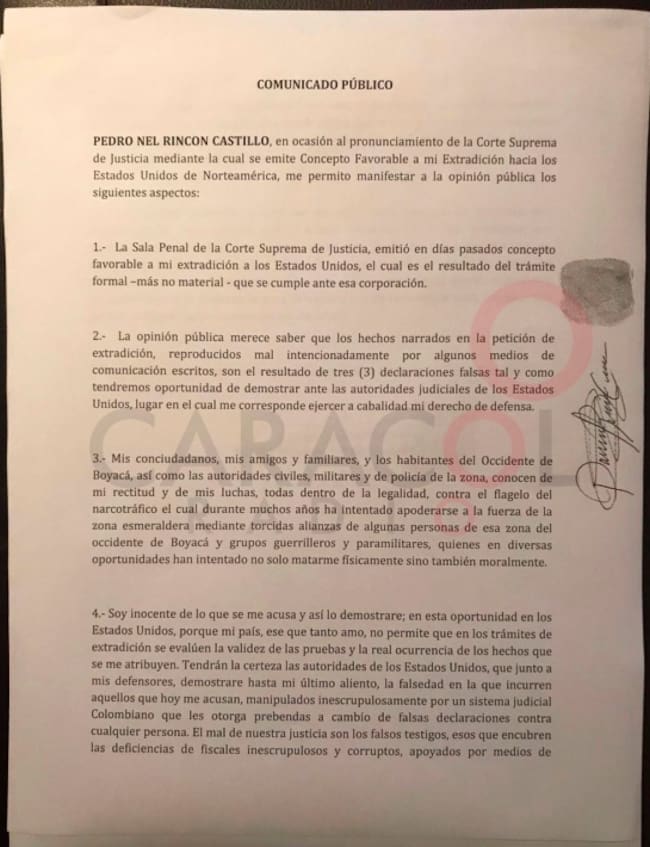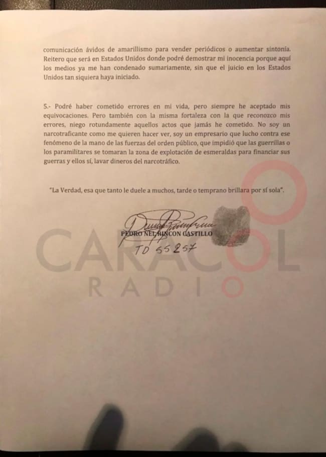 Desde la cárcel Picota de Bogotá donde purga una condena de más de 20 años por homicidio, Rincón Castillo escribió una misiva de dos páginas en donde aduce a su inocencia, y en donde niega ser un narcotraficante.