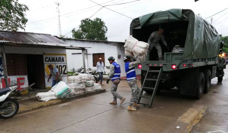 De la misma manera, se realizan apoyos aéreos, terrestres y fluviales continuos para movilizar a la población afectada hacia los puntos seguros y a personal de la Unidad Nacional para la Gestión del Riesgo de Desastres que atiende la emergencia. Hasta el momento se han transportado desde Guaranda (Sucre) hasta Achí 5.000 costales de arena para la construcción de murallas que permitan mitigar el riesgo de inundación en las veredas.
