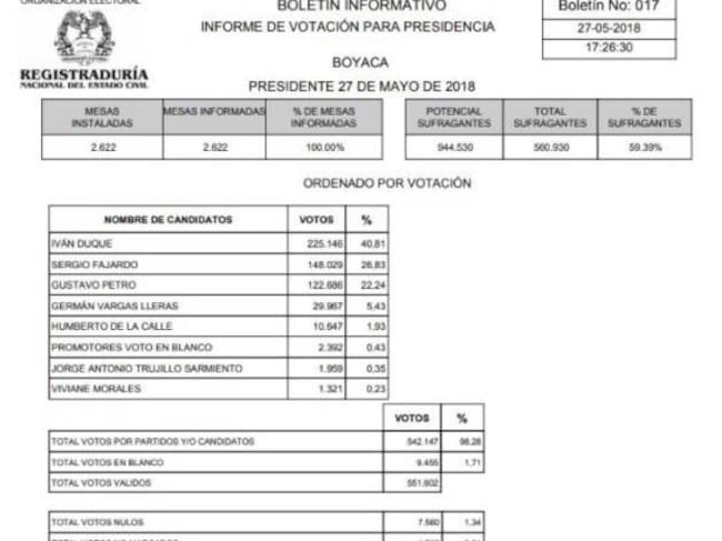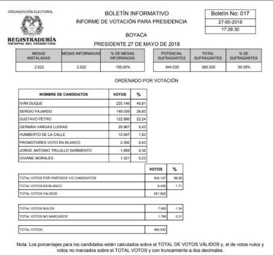 Con un 100% de mesas informadas , votó el 59% del potencial electoral del departamento: 560.930 ciudadanos sufragaron en los 123 municipios de Boyacá.