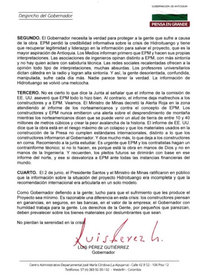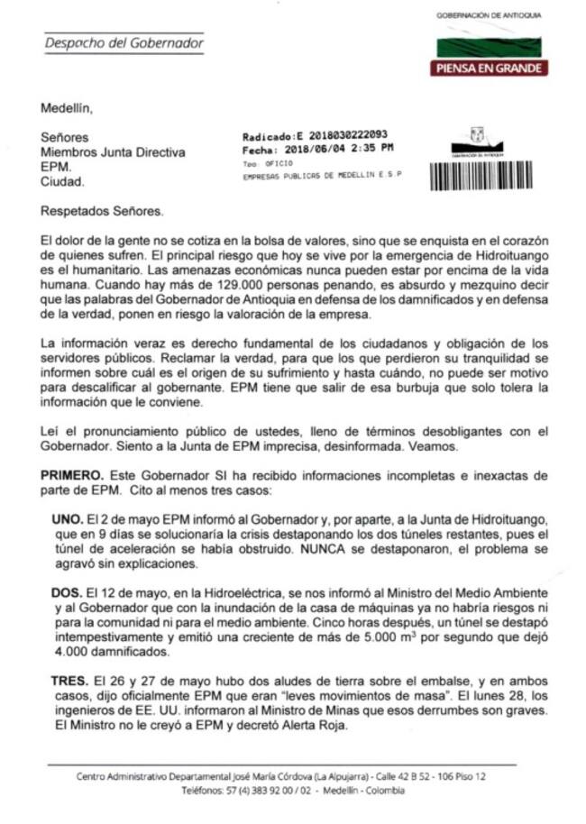 En una misiva a la Junta Directiva de EPM, el mandatario local reprochó que el informe de la comisión de expertos internacionales haya advertido que el grupo empresarial y constructor de la hidroeléctrica no procedió correctamente durante la este emergencia.