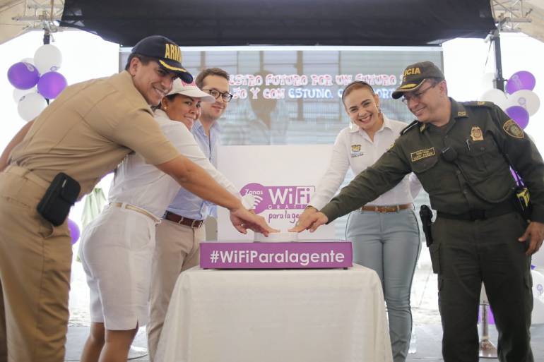 El ministro (e) de las TIC’s, Juan Sebastián Rozo, junto con Yolanda Wong, alcaldesa (e) de Cartagena y miembros de la Policía y Armada Nacional, entregaron 5 nuevas zonas de Wi-Fi gratis que funcionarán en las playas de Bocagrande
