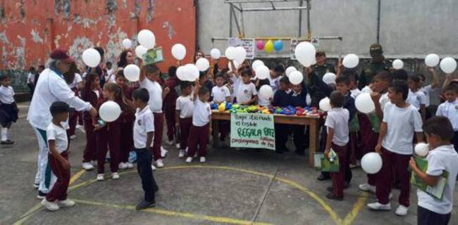 En la actividad participaron 150 niños de la sede educativa Rafael Pombo quienes entregaron alrededor de 50 de esos juegues bélicos que fueron cambiados por globos blancos y libros.