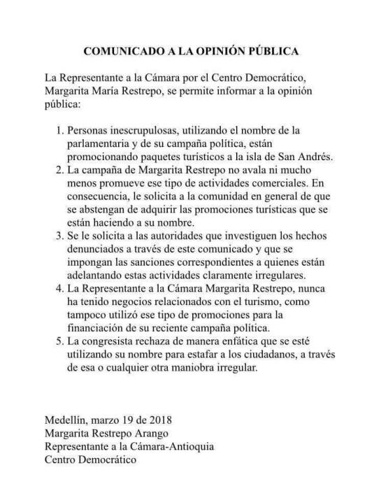 Ante la denuncia, la demandante se contactó con la Unidad de Trabajo Legislativo de la congresista y se reunió con dos personas de nombre Ignacio y Edwin, además de David Arango, quien se identificó como el esposo de la congresista, pero no se dio ninguna solución. Por el contrario, posterior a esto, emitieron un comunicado de prensa para advertir que personas inescrupulosas estaban utilizando el nombre de la política para ofrecer viajes y electrodomésticos.