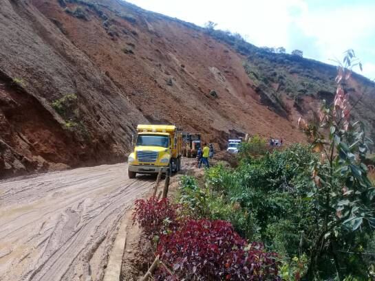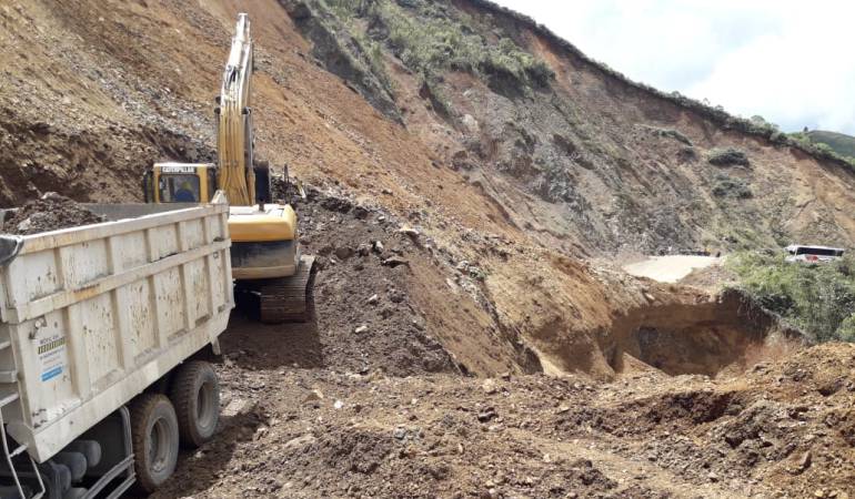 El percance se presenta exactamente en el PR 105+400 en el sitio conocido como el seis en donde con un cargador, una retroexcavadora y 18 volquetas se han removido cerca de 1.500 m3 del material que tapona la vía.
