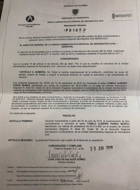 La resolución en la que se declara insubsistente a Pardo Muñoz, está firmada por el director de la Aeronáutica Civil, Juan Carlos Salazar Gómez.