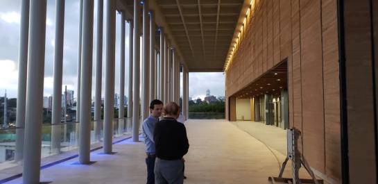 El centro de convenciones tiene 28 mil metros cuadrados; se conectará por un puente con Neomundo, una parque de ciencia y tecnología construido a comienzos del siglo. El gran salón está al ciento por ciento; "solo faltan unas pruebas de sistemas. Ahora sigue la integración que se divide en tres fases, la primera de las cuales avanza en un 35%" explicó el arquitecto Juan Manuel Fawcett.