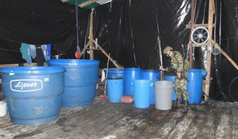 El laboratorio estaba dividido en cinco estructuras en las cuales se almacenaba sustancias químicas y otros elementos para el procesamiento del alcaloide.