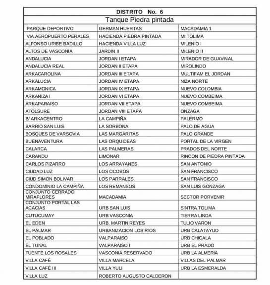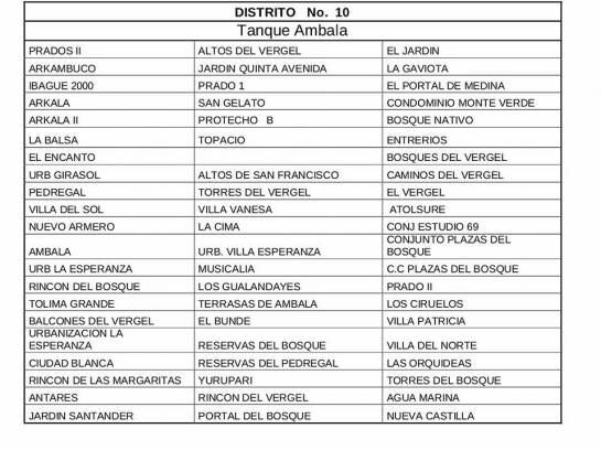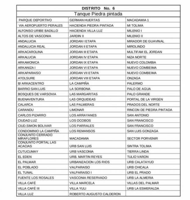 La empresa de acueducto y alcantarillado del Ibal, informó que este jueves 12 de julio 229 barrios de Ibagué, que hacen parte de las comunas 6, 7 y 8 no tendrán servicio de agua desde las 2 de la mañana del jueves hasta la misma hora del viernes 13 de julio.
