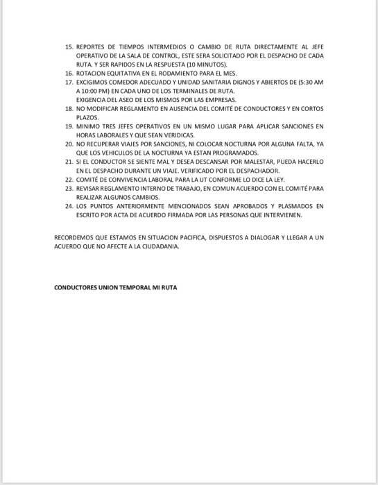 Este es el pliego de peticiones que los conductores negociarán con la Unión Temporal Mi Ruta, para retomar sus labores.