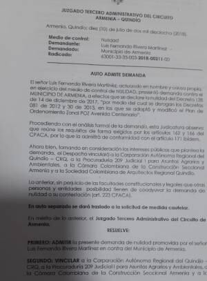 El juzgado tercero administrativo del circuito de Armenia admitió la demanda de nulidad contra los decretos que modificaron el plan de ordenamiento zonal de la avenida centenario de la capital del Quindío.