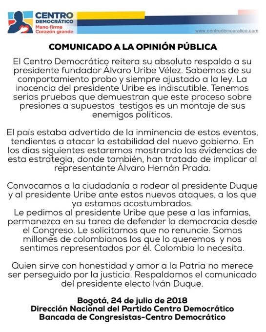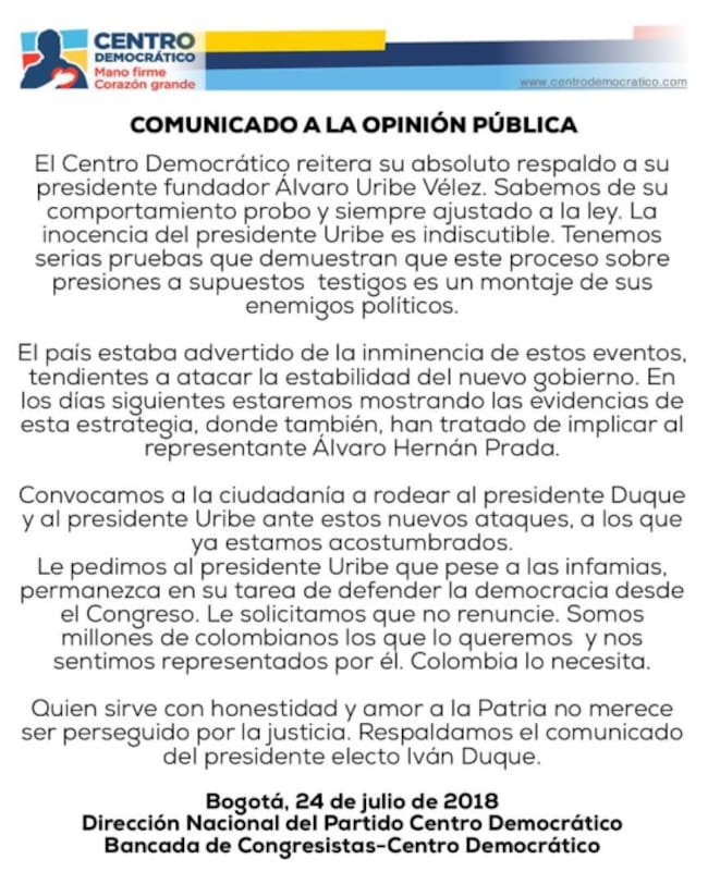 “Nuestro mensaje de solidaridad, apoyo y respaldo total a Álvaro Uribe Vélez, realmente somos muy solidarios en la toma de esa decisión y lo que rechazamos son las actuaciones sistemáticas que viene teniendo la corte suprema de justicia contra él, es una noticia que nos toma de manera sorpresiva y este hecho político toma toda la atención del país y también internacional”, dijo el funcionario.