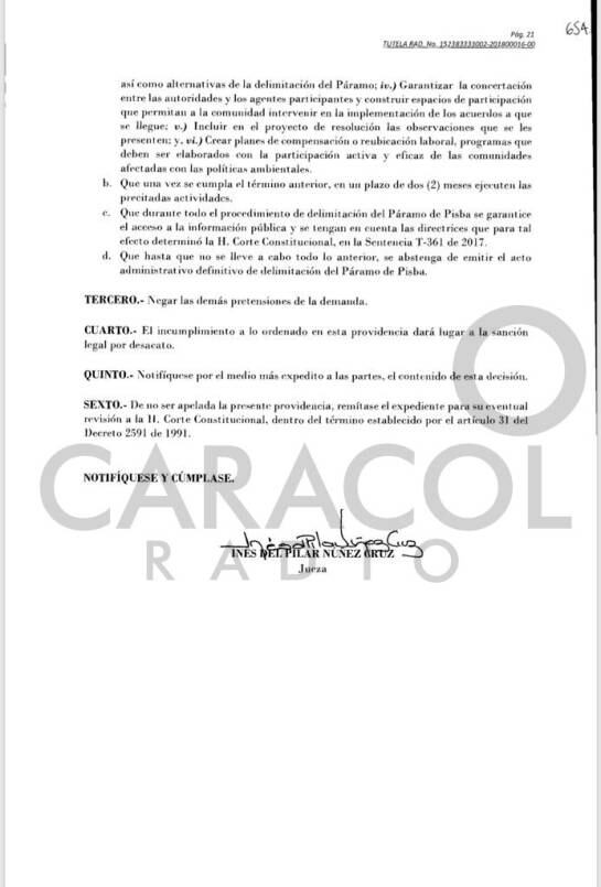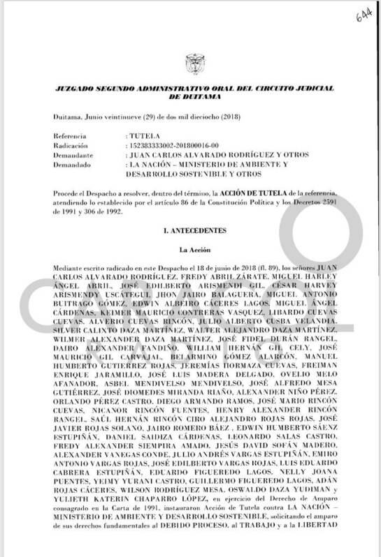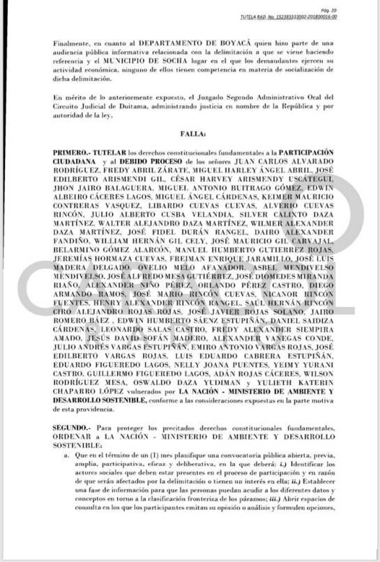 La jueza Segunda Administrativa Oral del Circuito Judicial de Duitama, Inés Núñez Cruz, tuteló los derechos constitucionales y fundamentales a la participación ciudadana, y le ordenó la gobierno que en un término de un mes, establezca una convocatoria pública, abierta, previa, amplia, participativa, eficaz y deliberativa, en la que deberá vincular a los actores sociales que deben estar presentes en el proceso de participación, debido a que serán afectados por la delimitación o tienen intereses en ella.