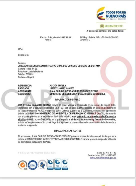Por su parte el Ministerio de Ambiente, en cabeza del ministro Luis Gilberto Murillo, impugnó la decisión del Juzgado Segundo Administrativo de Duitama, y pidió la nulidad de la decisión, con un recurso de apelación contra el fallo.