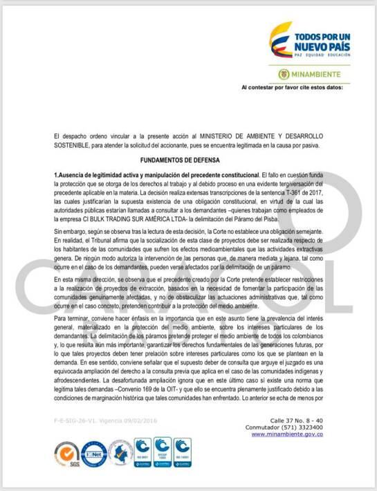 El ministerio alega la conveniencia y prevalencia de la protección del medio ambiente: “el estado tiene que cumplir con una serie de deberes ahora materializar la obligación de protección de ambiente sano consagrado en la constitución política de Colombia”.