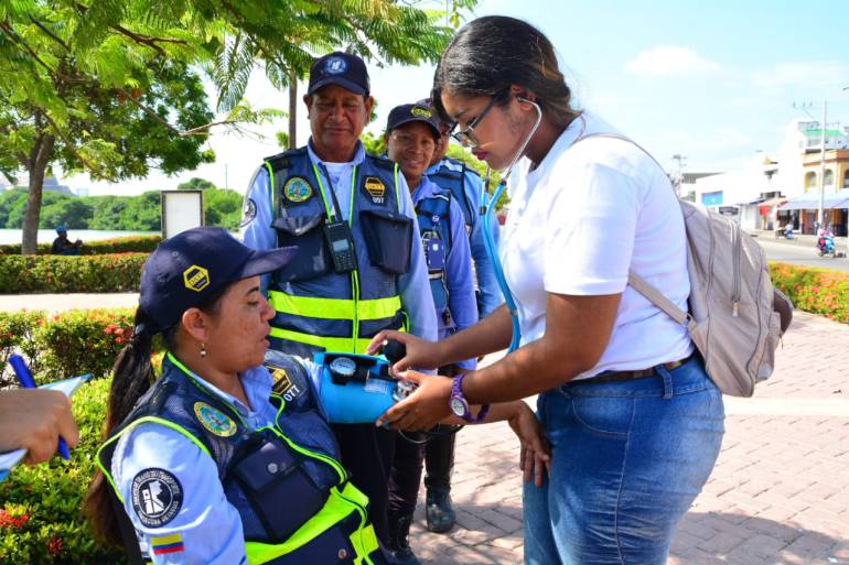Con el acompañamiento de delegados de la aseguradora de riesgos profesionales AXA Colpatria, se visitaron zonas como Bazurto, La Plazuela, La Castellana y Centro, sector India Catalina, en los que además de entregar hidratación a los uniformados, se les hicieron chequeos de la presión arterial, ritmo cardiaco, entre otros exámenes.