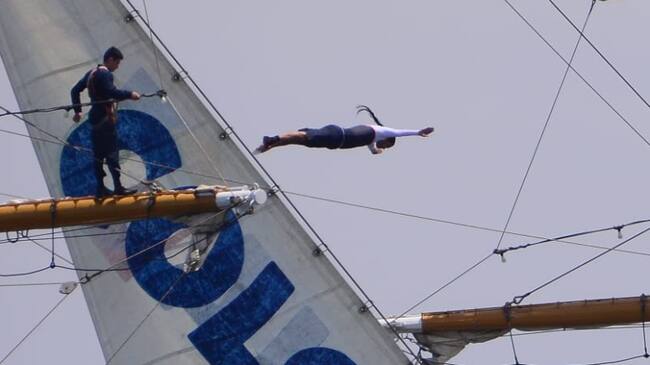 La mñana de este sábado, la Bahía de Santa Marta se engalanó con su presencia y además disfrutó de su talento, cuando practicó un salto de más de 40 metros desde lo más alto del Buque Escuela Gloria de la Armada Nacional, que dicho sea de paso está de celebración también al llegar a sus 50 años.