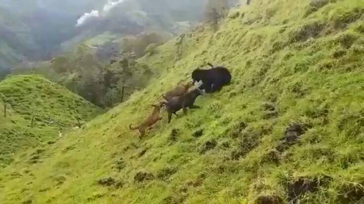 En el video que circula por redes sociales se observa al animal trepado en un árbol pero no logra sostenerse cayendo siendo alcanzado por los caninos que lo atacan en varias oportunidades. El oso de anteojos logra escabullirse hacia una zona boscosa.