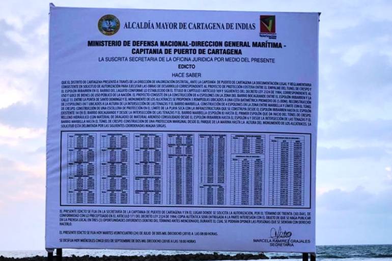 “En esta fase nos encontramos adelantando el trámite de permiso de intervención de zona de bajamar ante la Capitanía de Puerto y Dirección General Marítima, DIMAR de la ciudad de Cartagena, y dentro de los requisitos exigidos para dicho permiso se instalaron tres vallas publicitarias notificando mediante edicto las coordenadas y las características de este proyecto. Esta notificación es un requisito indispensable para que se expida en definitiva el permiso para el proyecto de protección costera”, afirmó Eduardo Simancas Castaño, subdirector Técnico de Valorización Distrital.