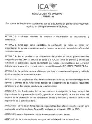 Resolución del ICA Quindío sobre cuarentena por influenza equina / Cortesía ICA
