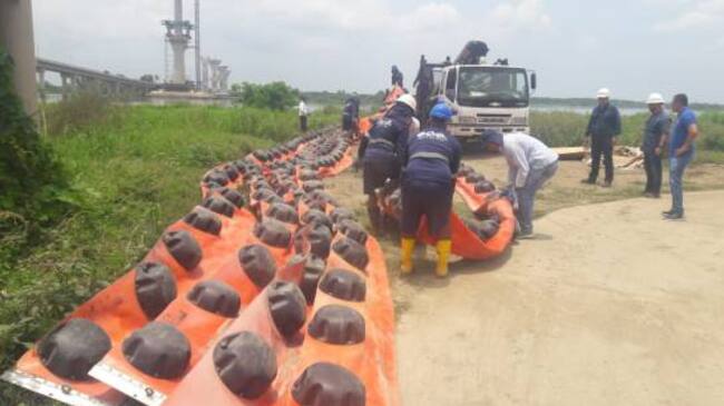 Las barreras con material absorbente fueron cambiadas en la tarde de este domingo por unas más fuertes con el fin de evitar una nueva emergencia ambiental como la ocurrida el día anterior y que dejó a Barranquilla y Soledad sin el servicio de agua potable.