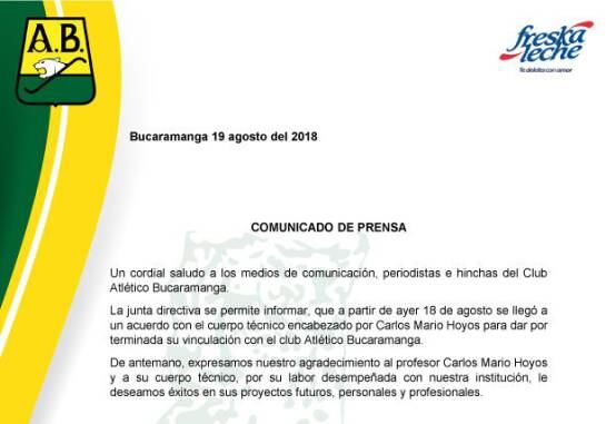 Un comunicado del club, en la mañana de este domingo, confirmó la salida del director técnico que sólo estuvo tres meses y en competencia 5 fechas. De un total de 15 puntos posibles, el cuadro solo ha logrado 4. "La junta directiva se permite informar que a partir del 18 de agosto (sábado) se llegó a un acuerdo con el cuerpo técnico encabezado por Carlos Mario Hoyos para dar por terminada su vinculación con el club Atlético Bucaramanga" consigna el boletín de prensa del cuadro leopardo.