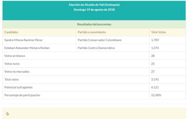 A los 43 minutos después de cerradas las urnas, finalizó el proceso de preconteo de los votos y Sandra Milena Ramírez del Partido Conservador Colombiano, fue el candidato con mayor votación con 1.789 sufragios. La segunda votación fue para Esteban Alexander Múnera Roldan del Partido Centro Democrático, con 1.374.