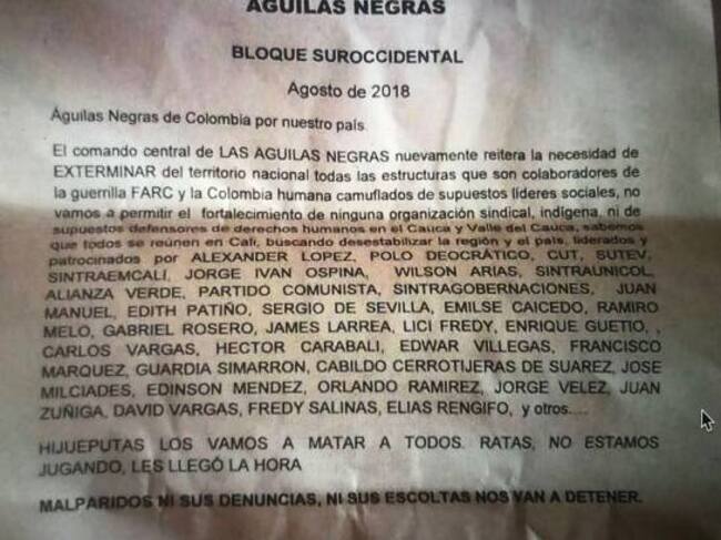La denuncia la hizo el ex Senador de la República Jorge Iván Ospina, a través de su twitter, pues recibió un panfleto de parte de “las águilas negras” en la cual le advierte estar en una lista que esta organización pretende exterminar.
