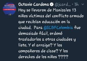 Entre los principales críticos de la decisión se encuentra el alcalde de la capital caldense, José Octavio Cardona León, quien a través de sus redes sociales cuestionó que no se respetara el arraigo y los derechos de los jóvenes.