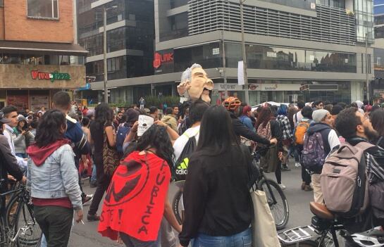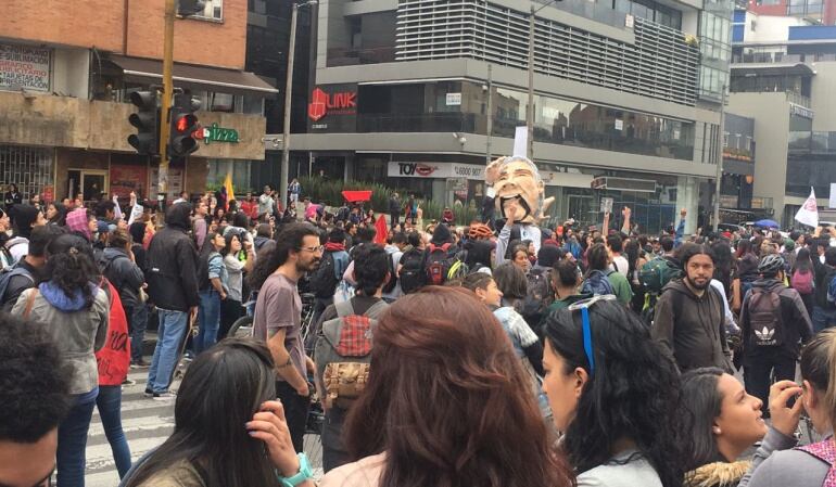 A la movilización también se suman estudiantes de la Universidad Pedagógica Nacional. Se desplazan por la Carrera Séptima, a la altura de la calle 60, en sentido norte – sur. Por las protestas los vehículos son desviados en la carrera 67.