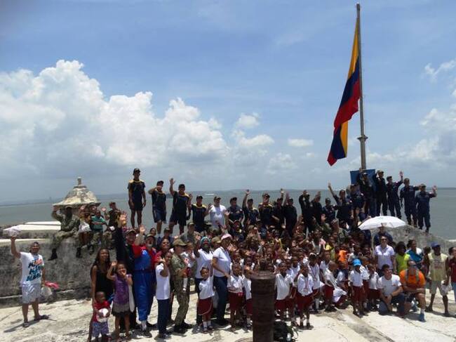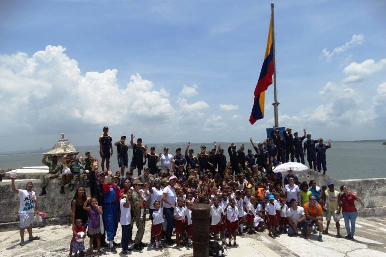 60 marinos de las Armadas de Brasil, Colombia, Ecuador, Estados Unidos y México, llegaron a bordo del Buque de Apoyo Logístico ARC “Golfo de Urabá”, de la Armada colombiana, hasta el mágico Fuerte de San Fernando, para llevar un rato de diversión y bienestar a 180 niños, quienes recibieron también la donación de 10 tableros acrílicos, 100 pupitres dobles con sillas, textos educativos y material lúdico y deportivo, donados por las delegaciones.