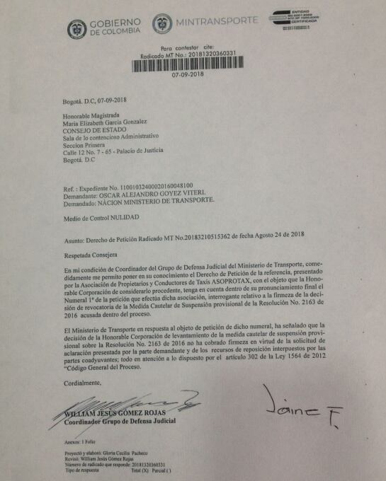 Una carta del Ministerio de Transporte, conocida por Caracol Radio y dirigida a la magistrada del Consejo de Estado, María Elizabeth García, certifica que la resolución de la Alcaldía de Bogotá que establece el reemplazo de los taxímetros por plataformas tecnológicas no se encuentra en firme.