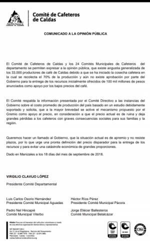 Desde el Comité se dio a conocer una comunicación en la que se solicita que “a la mayor brevedad se active el mecanismo propuesto por el Gremio como apoyo al precio, en consideración a que el precio actual es de ruina y deja grandes pérdidas a los cafeteros con graves consecuencias sociales para sus familias y la región”.