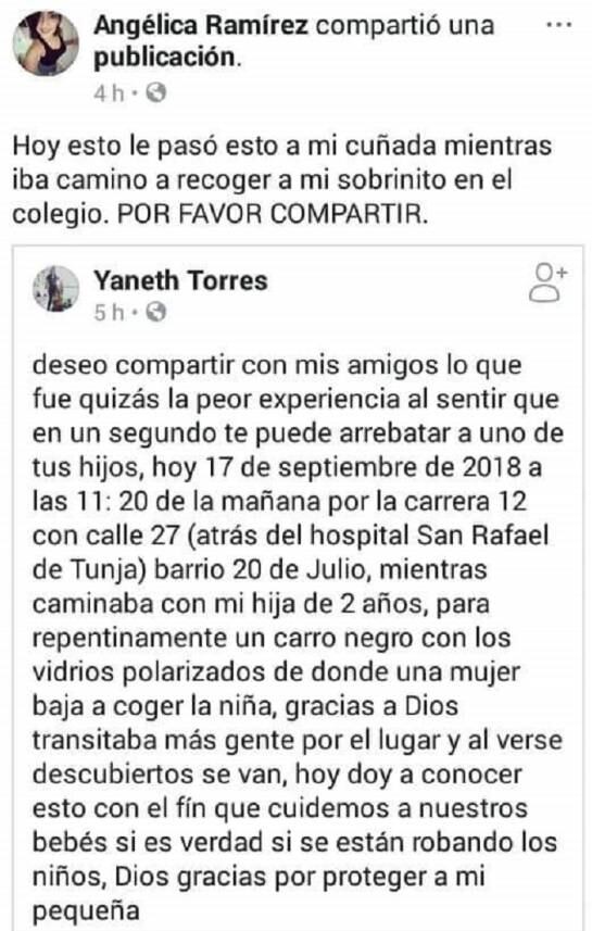 Por su parte la madre de la menor y autora de la publicación señaló a Caracol Radio que "cuando íbamos por vía publica con mi hija, frenó repentinamente un carro, la niña no está a la orilla de la carretera ni del andén, yo miro el vehículo, luego veo un carro con vidrios polarizados, una mujer bajó el vidrio del copiloto del carro, mira fijamente a mi hija, abre la puerta, ella no me miraba a mi sino fijamente a mi niña, yo sí me sentí amenazada e intimidada, luego cojo la niña y la paso para atrás mío, miro fijamente a la mujer, en ese momento había más gente en ese lugar que sintió exactamente lo mismo que yo, la mujer al verse ya descubierta, cierra la puerta, y arranca el carro. Yo luego me dirijo a mi destino, y ahí entro en pánico como cualquier papá, yo no pensé en denunciar sino sólo en asegurar a mi hija", dijo Yaneth Torres.