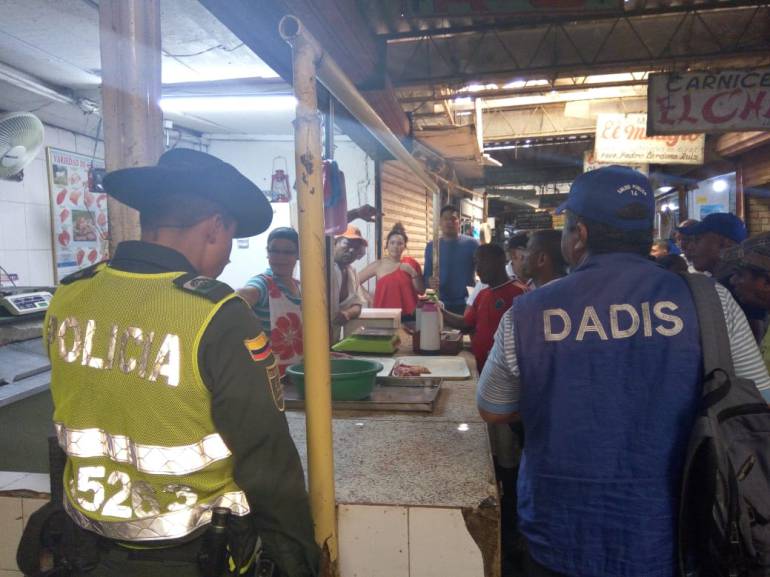 Los funcionarios de salud del Dadis realizaron recorridos acompañados de unidades de la Policía Ambiental y de Carabineros, funcionarios de la administración del mercado y el director operativo de Salud Pública del Dadis, por los expendios de carnes del Mercado de Bazurto y se reunieron con muchos de los propietarios para establecer los adelantos en el cumplimiento de los requisitos en sus locales.