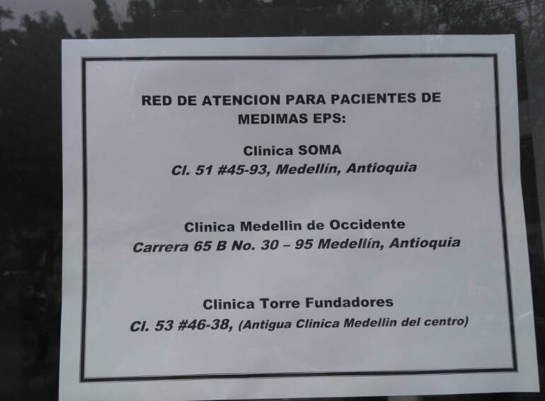 En comunicados informan sobre otros puntos de atención disponibles, pues al que acudieron ha sido cerrado por los problemas de sanidad que afectan la salud de los pacientes, en su mayoría vinculados a la EPS Medimás.